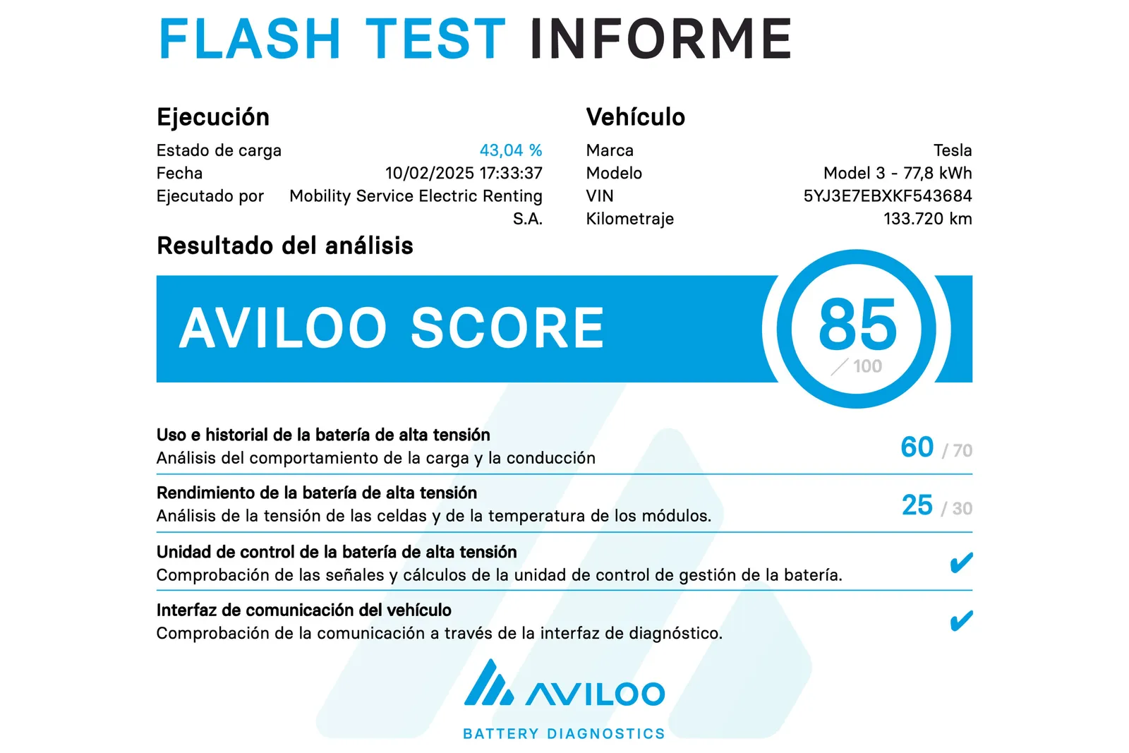 En un vehículo eléctrico ya usado, la clave es verificar el estado de la batería para conocer de antemano su autonomía real estimada. Por eso, todos nuestros vehículos ReDrive cuentan con la certificación de AVILOO, un diagnóstico especializado y reconocido oficialmente para comprobar el estado de salud de la batería (SoH) en vehículos eléctricos, que avala su rendimiento actual y durabilidad. Cuanto mayor es el AVILOO score mejor es el estado de la batería.